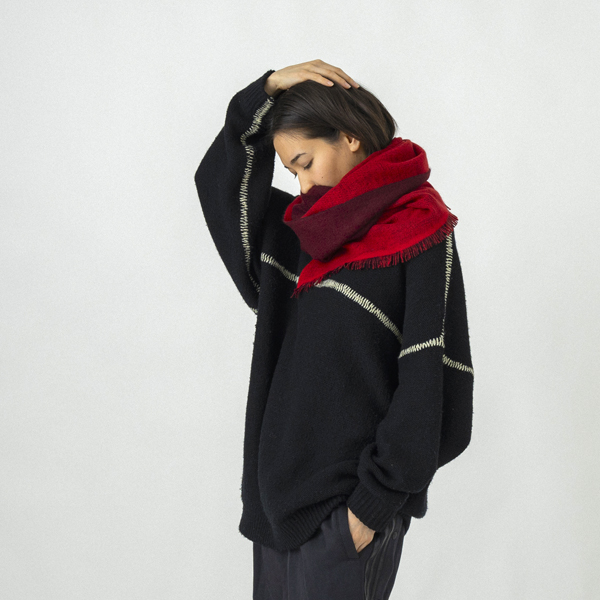 Price: $37.00 / €30.50 Color: *BLK x PPL *NAV x MOSS *TQ x BRW *CHERRY x BRW *OFF x LT.GY Made in: NEPAL Material: WO 45% AC 35% MO 20% Size (about): 185cm x 20cm HAND MADE